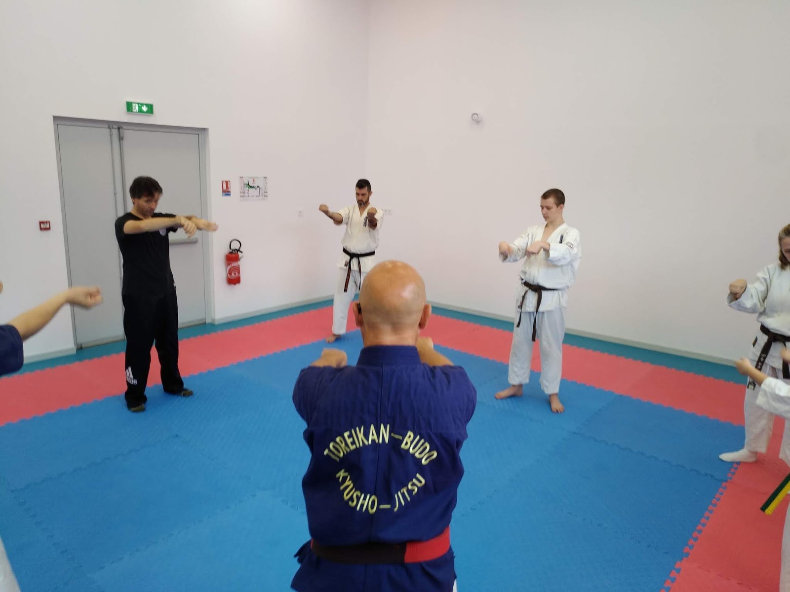 El curso organizado por el Maestro Jean-Paul Bindel, fundador del Toreikan Budo, se inició con unos ejercicios de calentamiento guiados por el Sempai David Belmonte para dar paso a la primera sesión dedicada al Shintaikan Yubibojutsu. El Shihan Pedro Hidalgo desarrollo las series de Kihon de Tsuki y Kensui pertenecientes al programa técnico de la escuela, practicando a continuación diferentes técnicas de los tres primeros niveles del programa de experto en Shintaikan Yubibojutsu. Para finalizar esta primera sesión los asistentes pudieron demostrar sus conocimientos en unas entretenidas series de Randori con Yubibo.